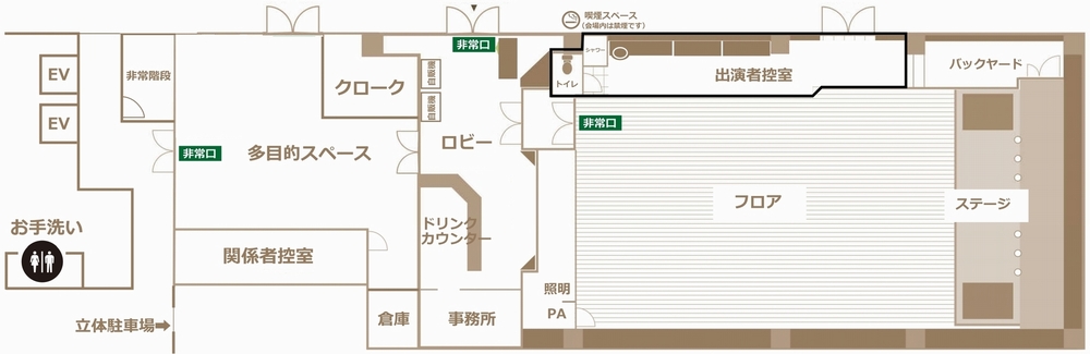 | 広さ | ■ステージ/幅8.5m×奥4mなど、可動式ステージなので自由にアレンジできます。 ■ホールフロア/9m×14.5m、130㎡、40坪、79帖 ■多目的スペース/物販、機材置場、大控室等としてご利用いただけます。 |