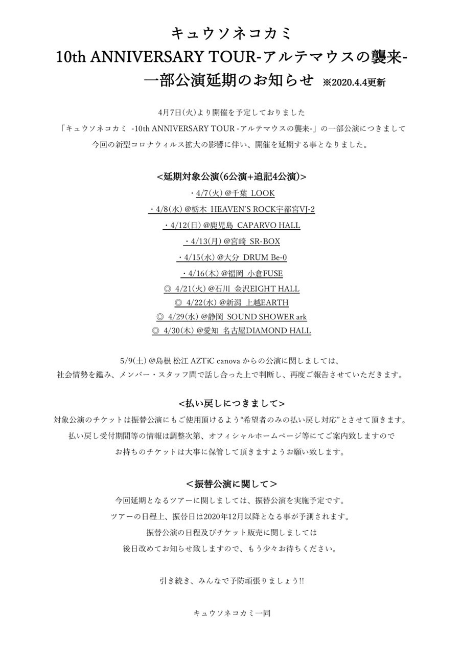 4/29(Wed) キュウソネコカミ【公演延期】キュウソネコカミ 10th ANNIVERSARY TOUR -アルテマウスの襲来- SOUND SHOWER ark 清水 開場時間 17:15 開演時間 18:00 前売券 スタンディング:4,200円(税込・整理番号付) 当日券 出演者等 キュウソネコカミ お問い合わせ 株式会社ジェイルハウスTEL 052-936-6041 【受付時間】平日11:00〜19:00 その他 ※別途ドリンク代:600円が必要